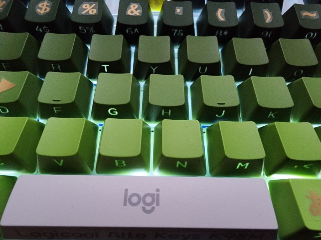 この前提条件を知らずに、単にフロント刻印、キーキュップの手前が光るキーキャップを克ってしまい、装着しても部屋を真っ暗にしないと視認出来ない状態で完全にブラインドタッチ訓練キーキャップになっている。