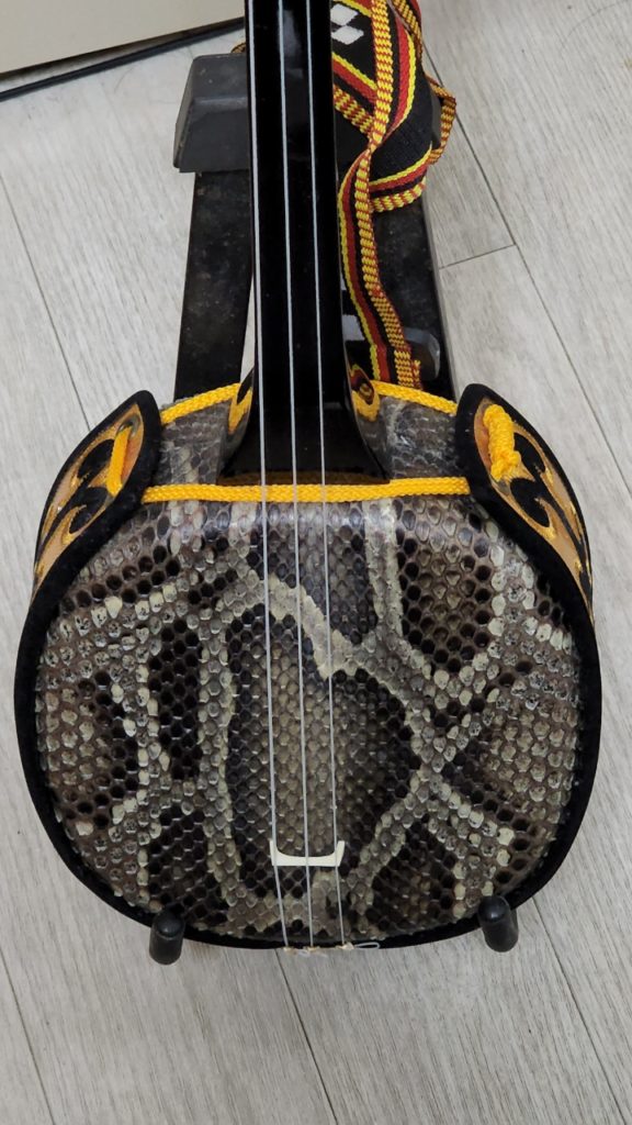 だいぶ前に買った三線で蛇革の一番安い強化張りのにして確か5万円にしてもらった。