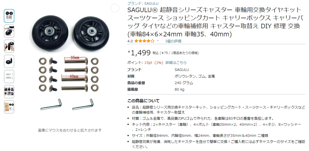 ただ、この車輪は80mmでちょっと純正の車輪より一回り小さくて、その辺も回転数が多くなるわけだから負担も大きいわけで、純正の車輪でも2年持ったか、キャリーバックを買ったのがいつだったかわすれたが、3年は持ったかとは思うが、まぁベアリングが壊れたままでひきづって使っていたので、実質2年程度だったように思う。