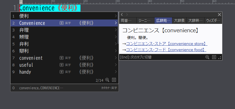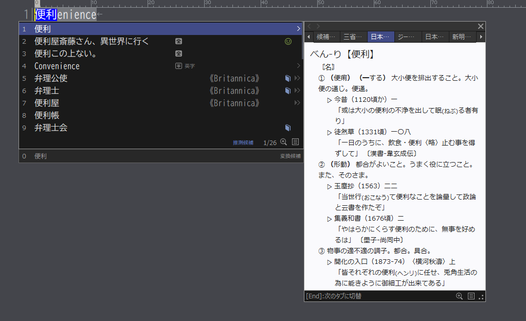 変換するときも知らなかったのだが、スペースではなくてTABを押すと推測候補変換できる事がわかったのでこれはかなり便利かもしれない。