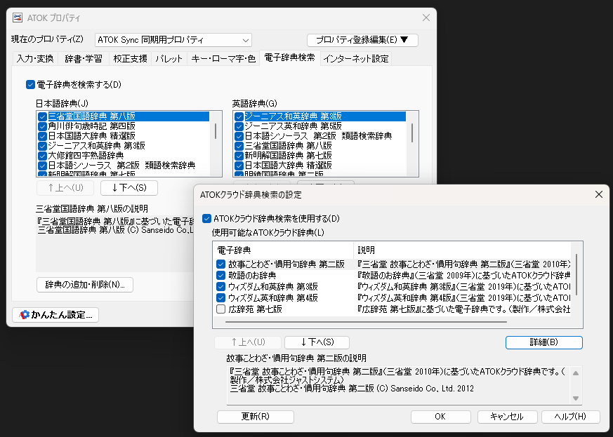 クラウド辞書はローカルにインストールしている辞書と被るので結局4種類の電子辞書しか使ってないが、これだけ辞書入れているのだが速度的に何ら問題無くサクサク使えるのでMS-IMEなんかもう入力しづらくてしょうがない。