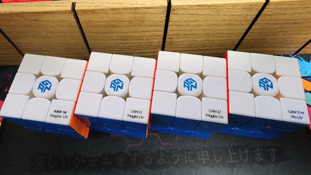 GANキューブの11,12,13,14を回し比べしてみたのだがどれが一番と言うのがどうにも決められず、どれも回しやすいのに微妙に個性があってそれぞれ特徴を指で感じる事が出来る。