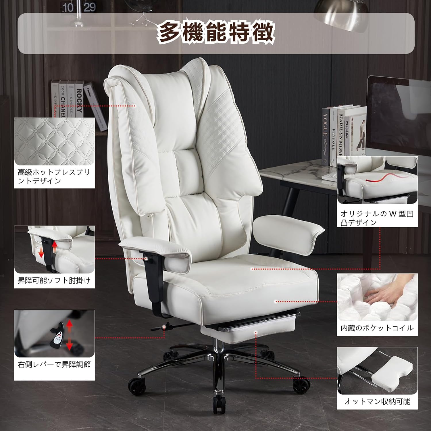 次に、「昇降可能ソフト肘掛け」これ、今回結構重要視した機能で、机の上で椅子を回転させた際に、今までのゲーミングチェアだとガスシリンダーを目一杯上に上げて使っていると肘掛けが机にあたって回転出来ないのでちょっと椅子を机から離す必要が出てくる。