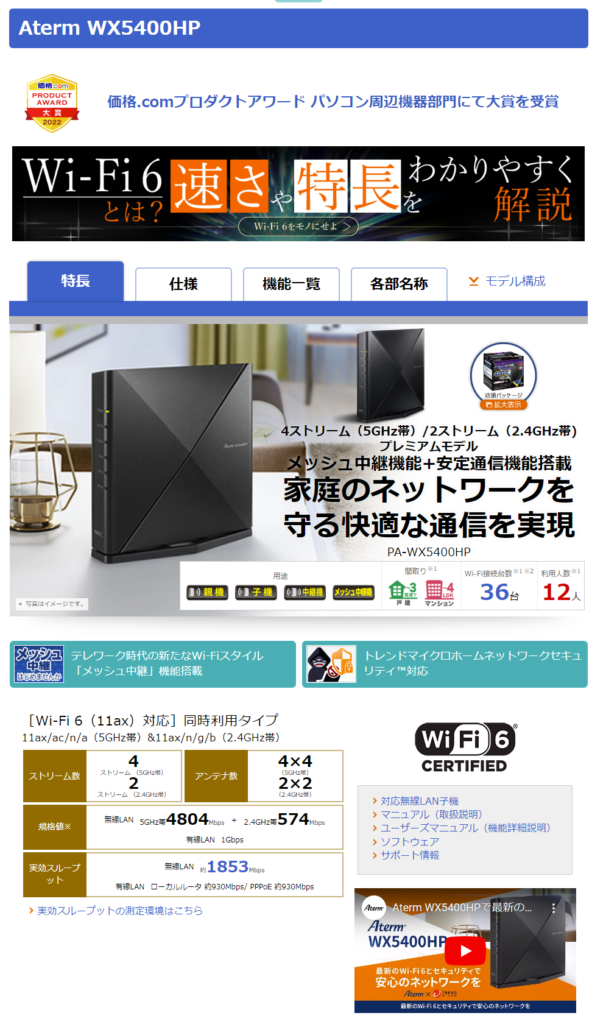 買い換えたルーターは同じNECのAtermで、今度はこのWX5400HPにした。