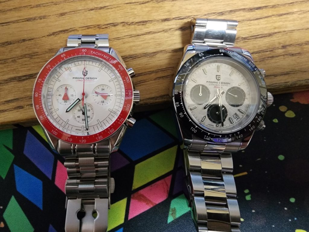これは、右のデイトナオマージュを使っていてかなり質感も良くクウォーツなのに見た目もGoodな時計なんだが、更にスピードマスターのオマージュは視認性も良く反射防止加工もしているとの事でおきにいってしまった。