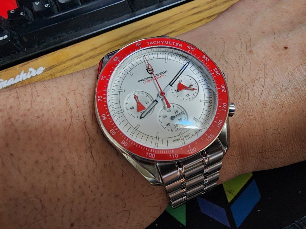 しばらく使って見たのだが、デイトナのオマージュはカッチリと時計感が有ってとても良かったが、スピードマスターのこの赤ベゼルはおしゃれ感があって良い。