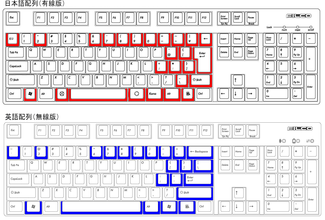 この配列を見る様に、色が変わっている部分が英語配列と日本語配列の違いで結構あって数字キー部分は全滅だな。