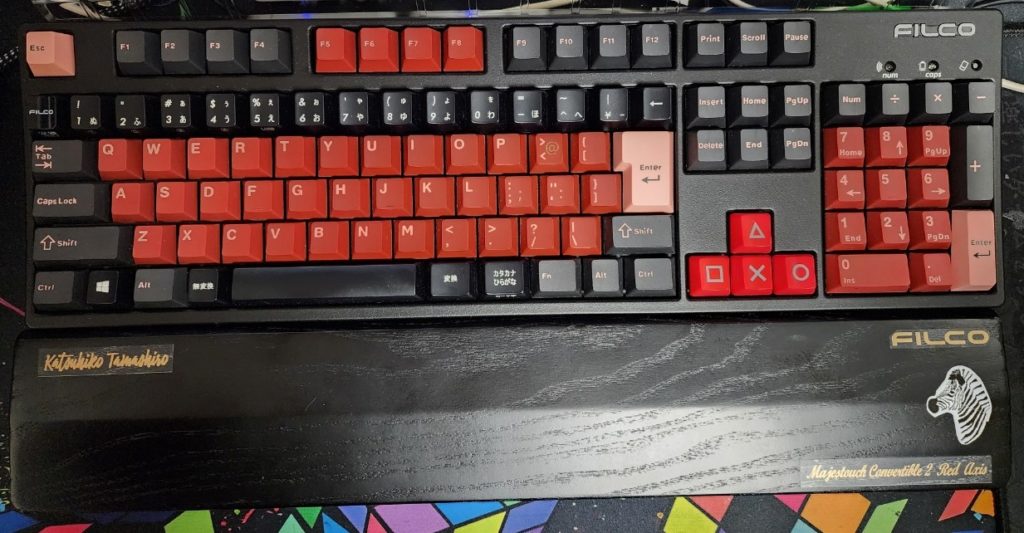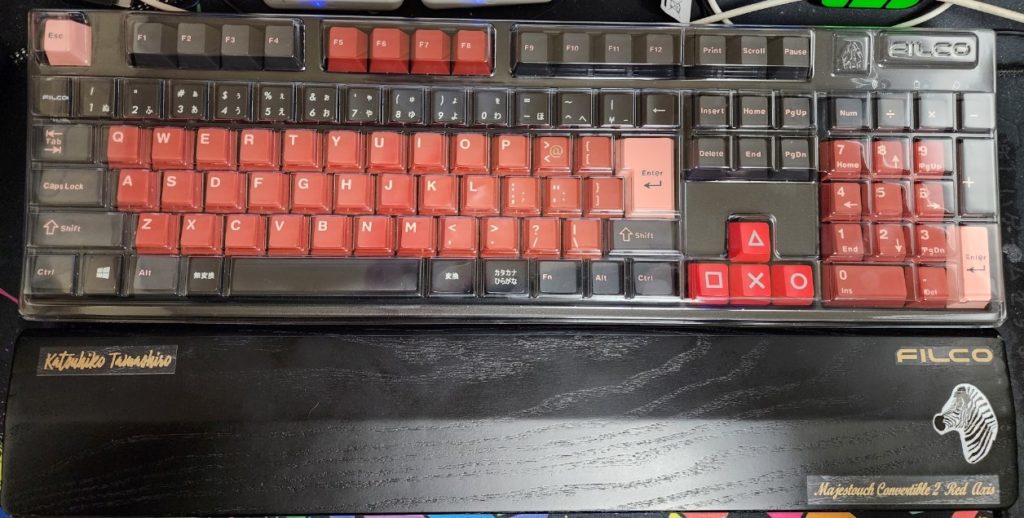 FILCOキーはキーボードカバーに付いていたものでテカテカしているキーで、Majestouch3はキーキャップがPBTでこれになったんだろうか。
