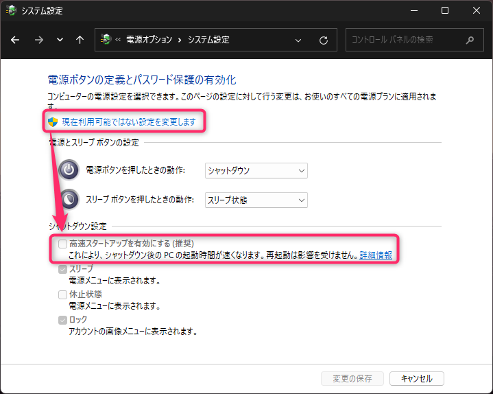 高速スタートアップを有効にする(推奨)と言うチェックが入っているとSSDだと余計遅くなっていき果てはPCの不具合が頻発することにもなる設定で、SSDがWindowsの起動ストレージになっている場合はチェックを外した方が良い。