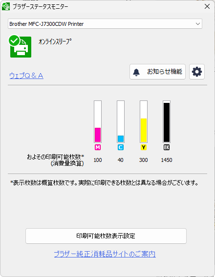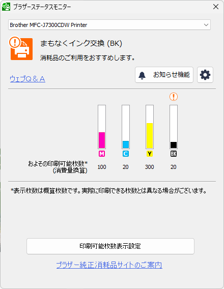 残り20枚になってから、インク交換のメッセージが出て交換して1450枚になって、それからB4の楽譜を10数枚印刷しただけなんだが、1450枚から1350枚と100枚も一気に減った。
