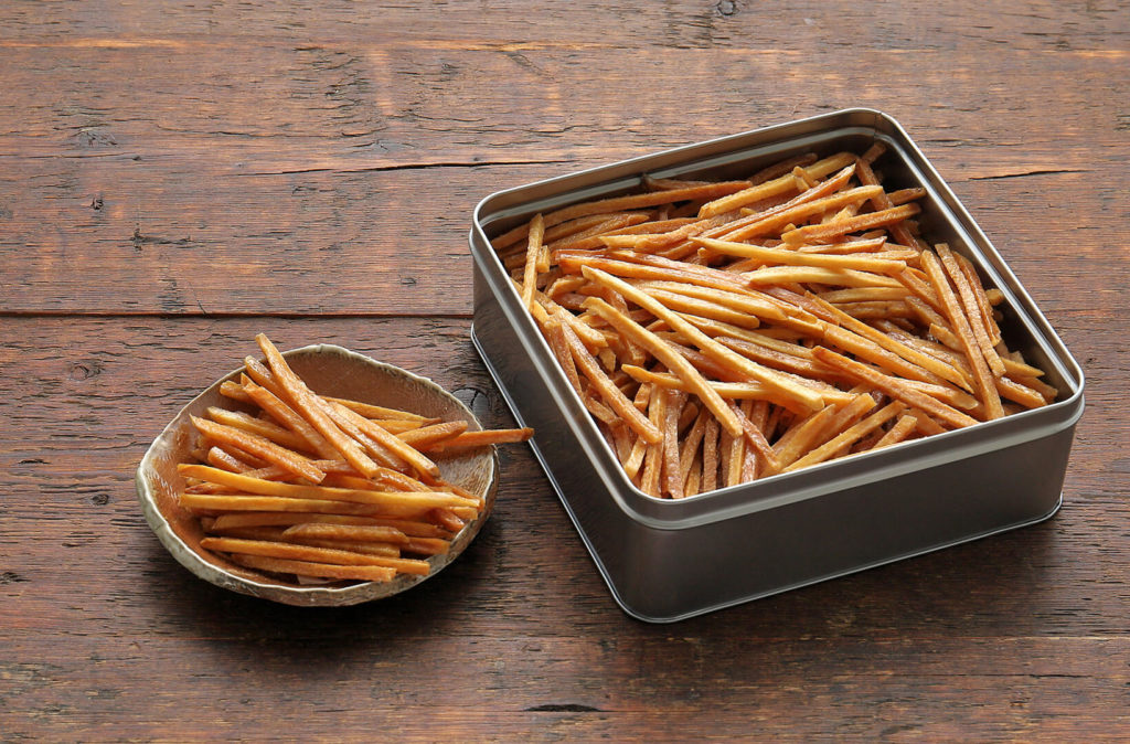 何がいいのか解らんが製法に拘りがあるのか、材質に拘りがあるのか、なんしか箱に入っていて、届いた時、靴でも届いたのかと思うような靴箱サイズの箱に芋けんぴが6袋入っていた。