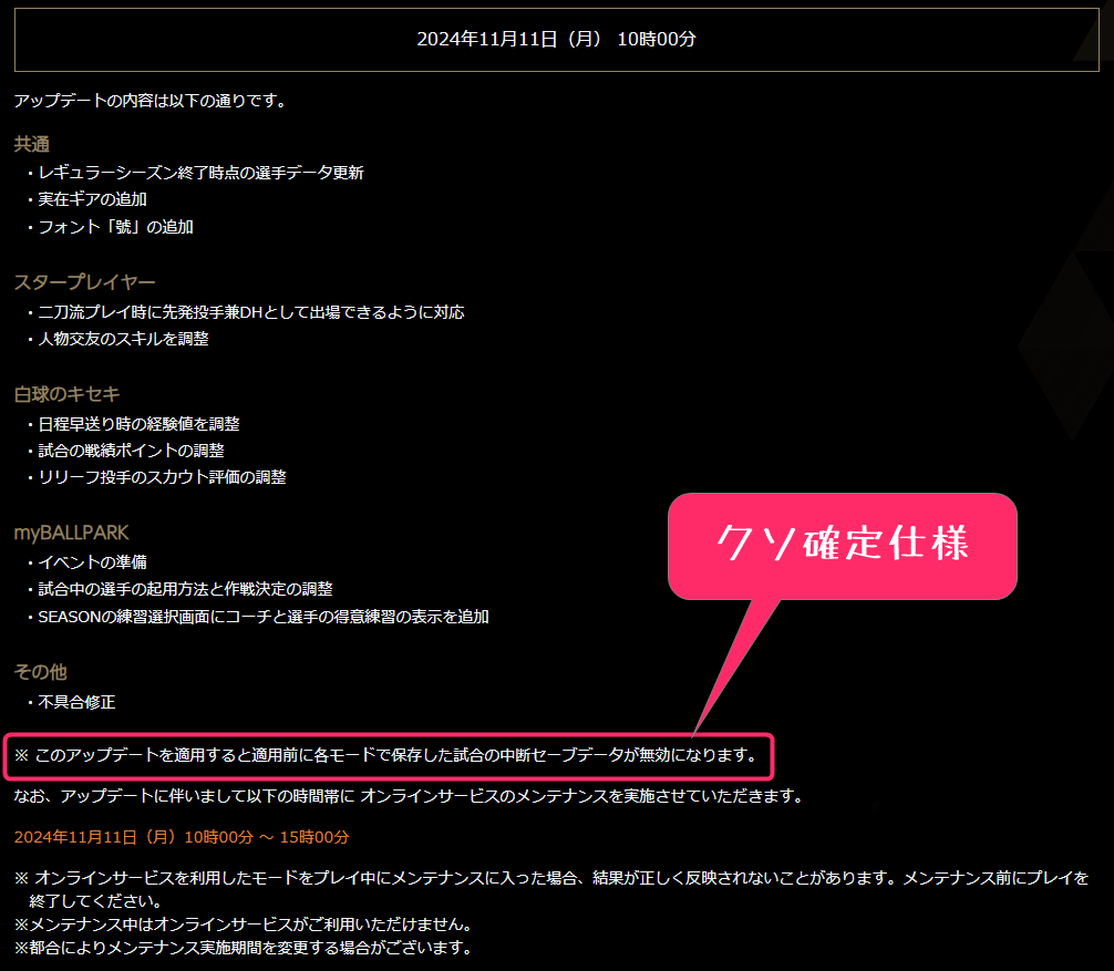 しかしプロスピ、ゲーム自体は非常に面白いし、テレビでみる野球そのもので楽しめたんだが、アップデートした際に過去に保存したデータは置いてけぼりで、新たにやり直す事を余儀なくさせる仕様に驚いて遊ぶのをやめた。
