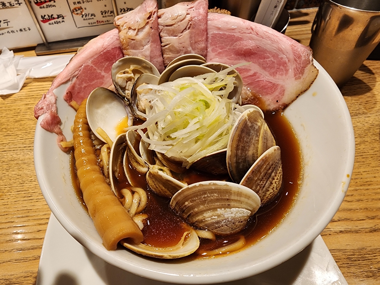 系列のジンメンは残念でむしろマズイラーメン屋でショックだったのだが、ここは貝だし専門ということで期待した通りの貝出汁でスープは最後まで飲み干すことが出来たので良し。