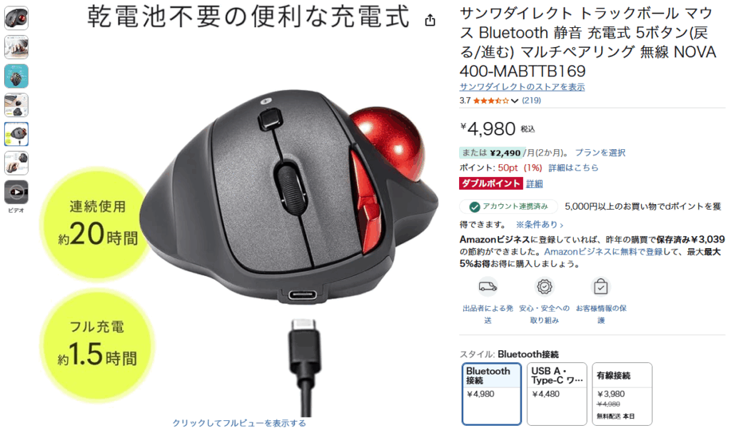 それは、全部Bluetoothのトラックボールで充電式なんだが、前に使って居たサンワのMA-WTB178BKはVerticalタイプで非常に使い勝手は良いのだが、ホイールが人差し指で操作する若干特殊なタイプ