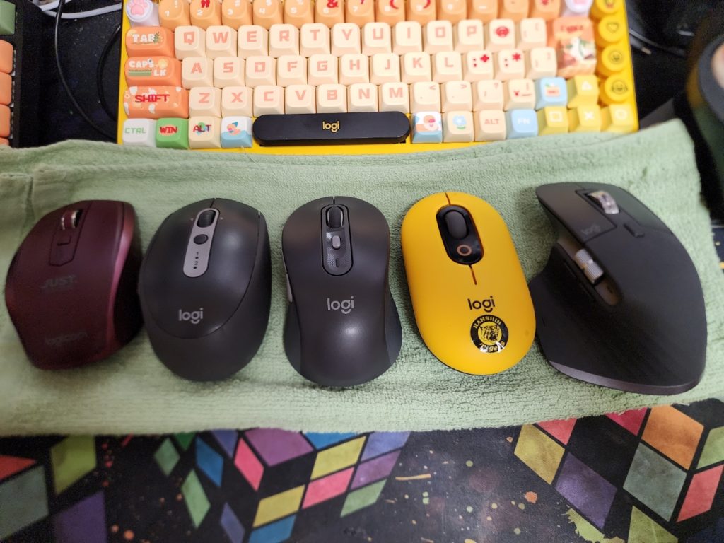 これは全部Logicoolのマウスなんだが、左からMX Anywere2 With Justsystem、M590、M750、M370、MX Master 3S の5台