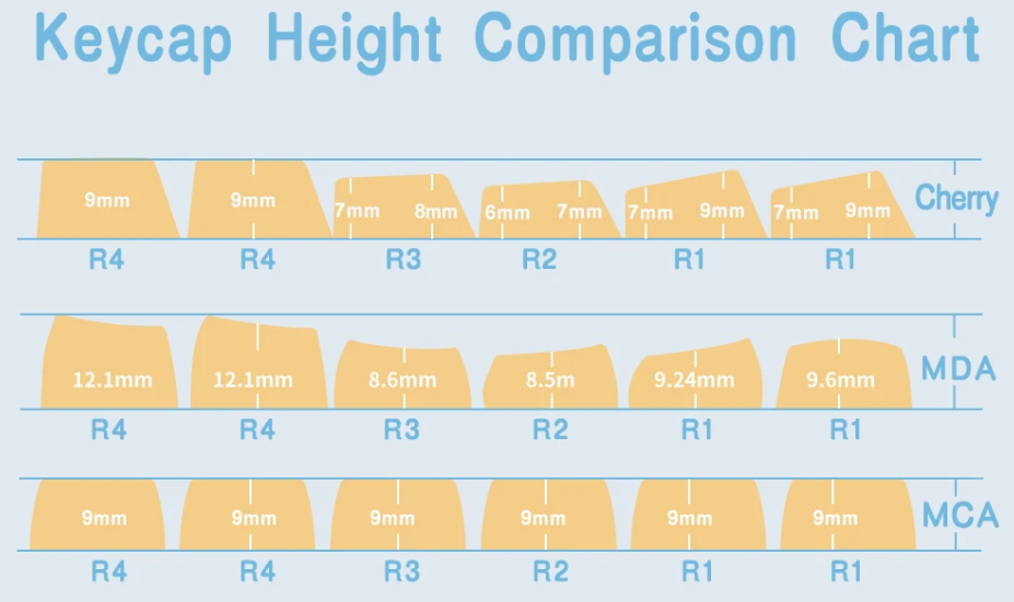 見てわかる通り、キーキャップの角度の事なんだが、MCAプロファイルはどの場所のキーでもどの位置に付けても同じフラットなキーボード面になって、MDAやCherryフォーマットだと微妙な角度差があるので対応している段意外の位置に付けると微妙な角度差が気になってしまう。