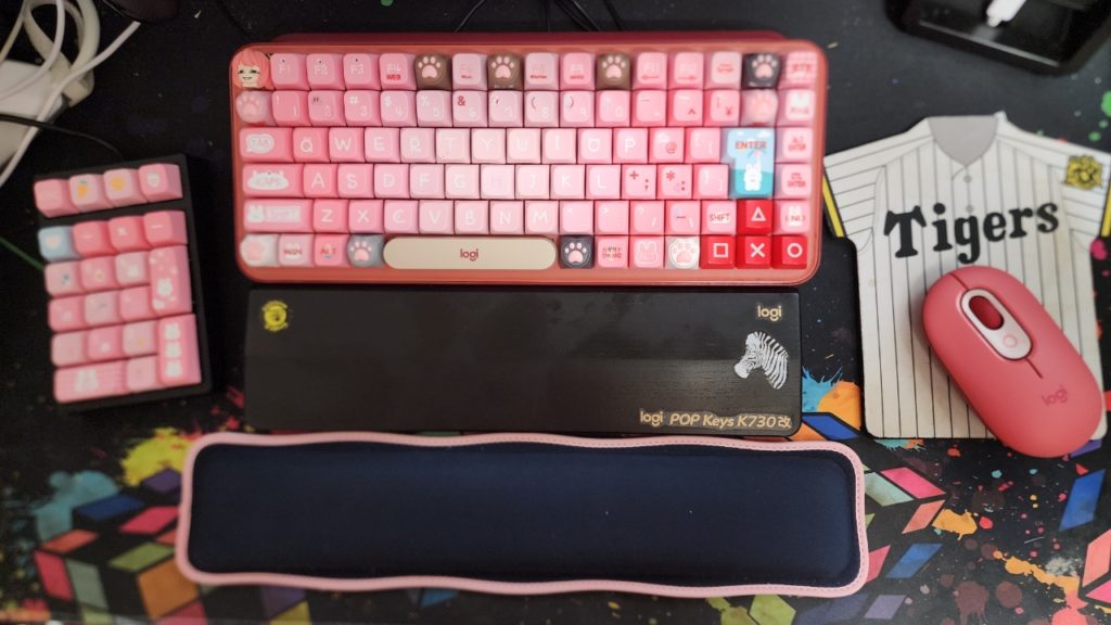 ピンクは、ジャンク品の復活キーボードで、部品取りにはもったいないのでちゃんと普通に使える様にキーキャップの色味をピンク系のPOP Keysにしたと言うわけだ。