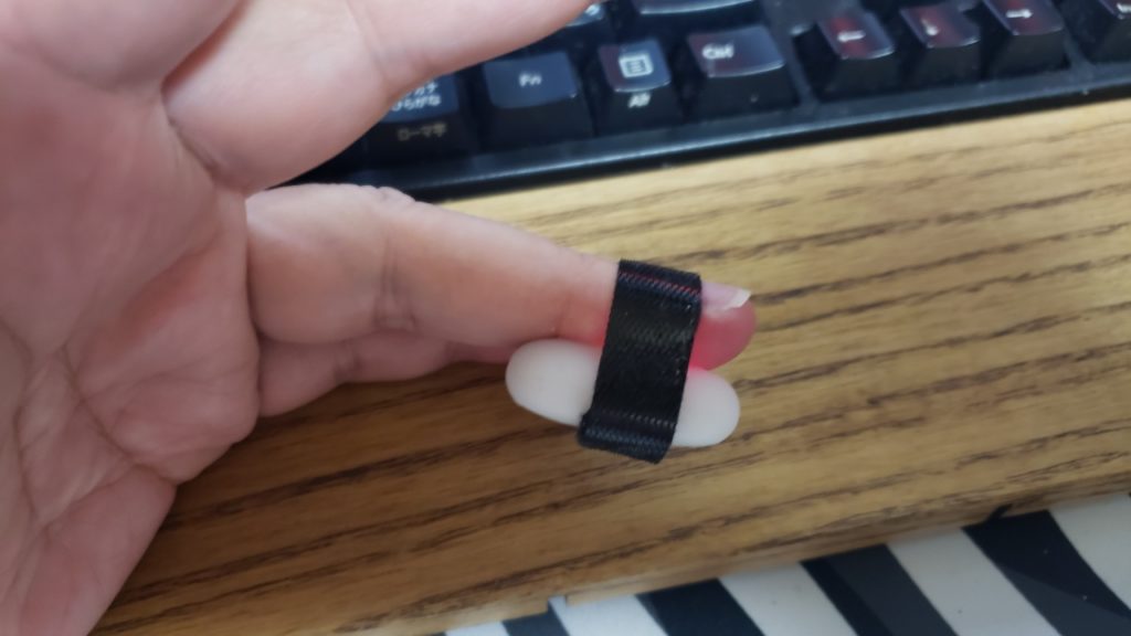 本当は爪側が良さそうなんだが、固定する方法がなかなか色々と工夫しているのだが寝ている最中の動きを想定するとちょっときつめに固定しなければならず、そうなると痛さが出てくるので純正の指先サックが待ち遠しい。