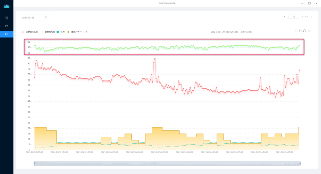 このグラフを見ていていつも思うのが心拍数が上がっている時、REM睡眠状態に入っている。